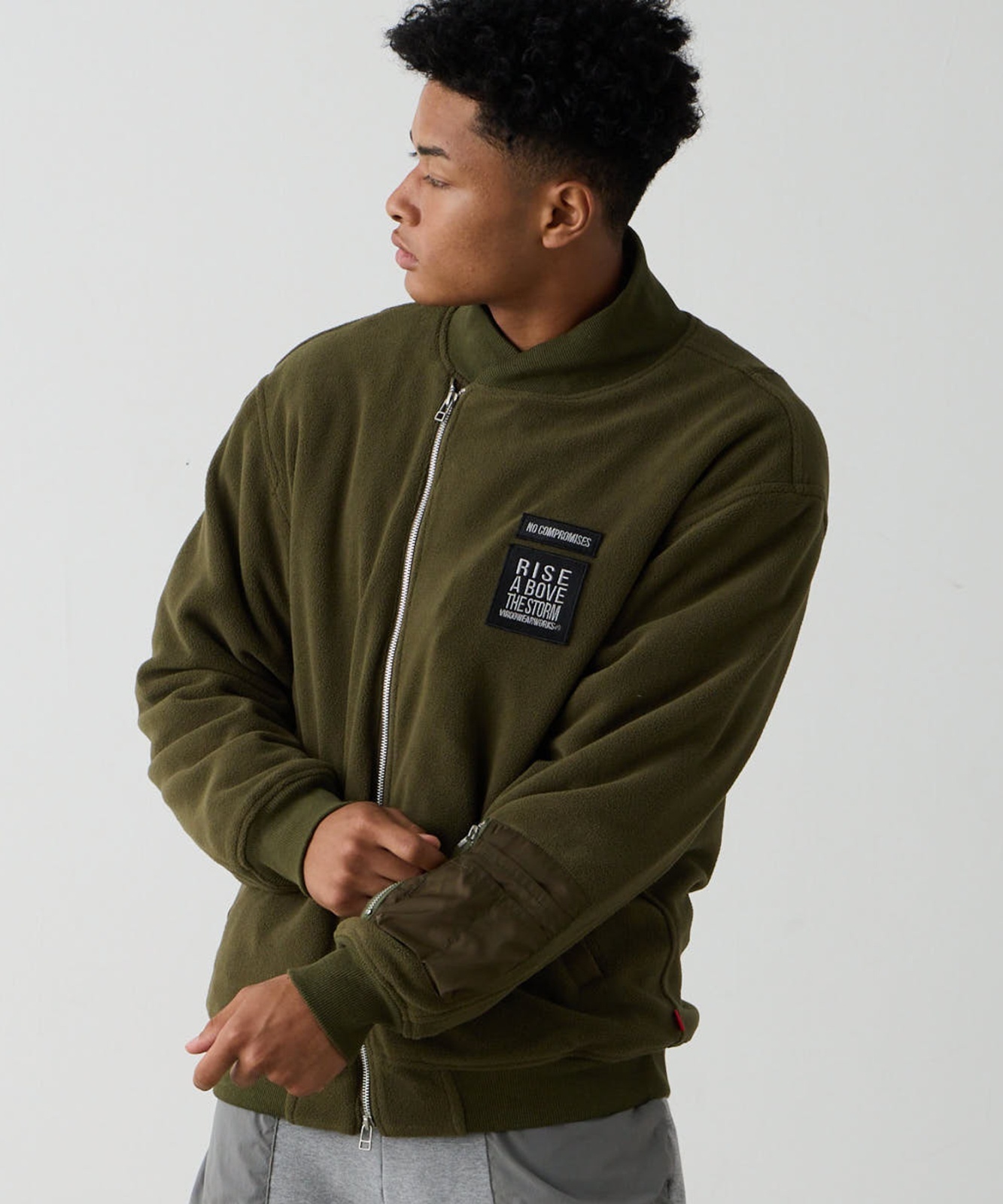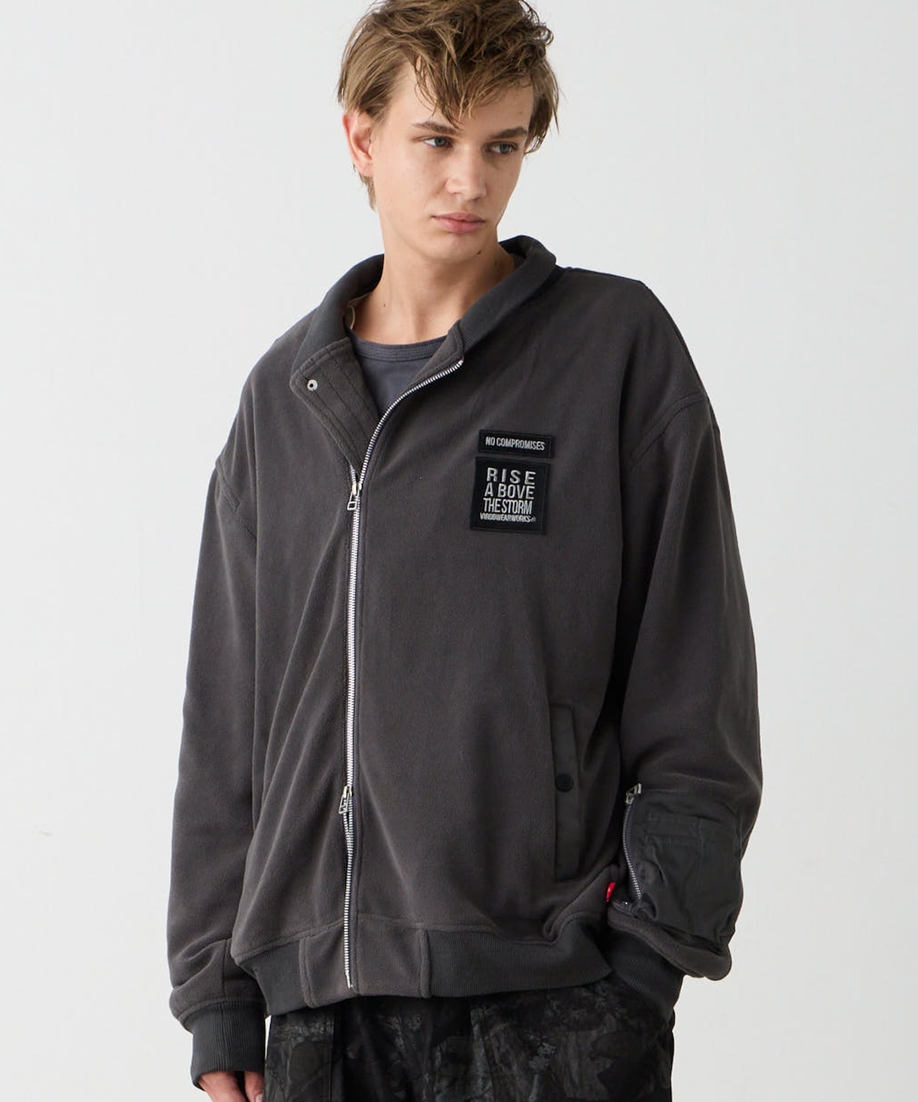 ややワイドなシルエットに加え、斜めジップやナイロン切り替えのポケットフラップ、左袖のシガーポケットがアクセントになっています。
