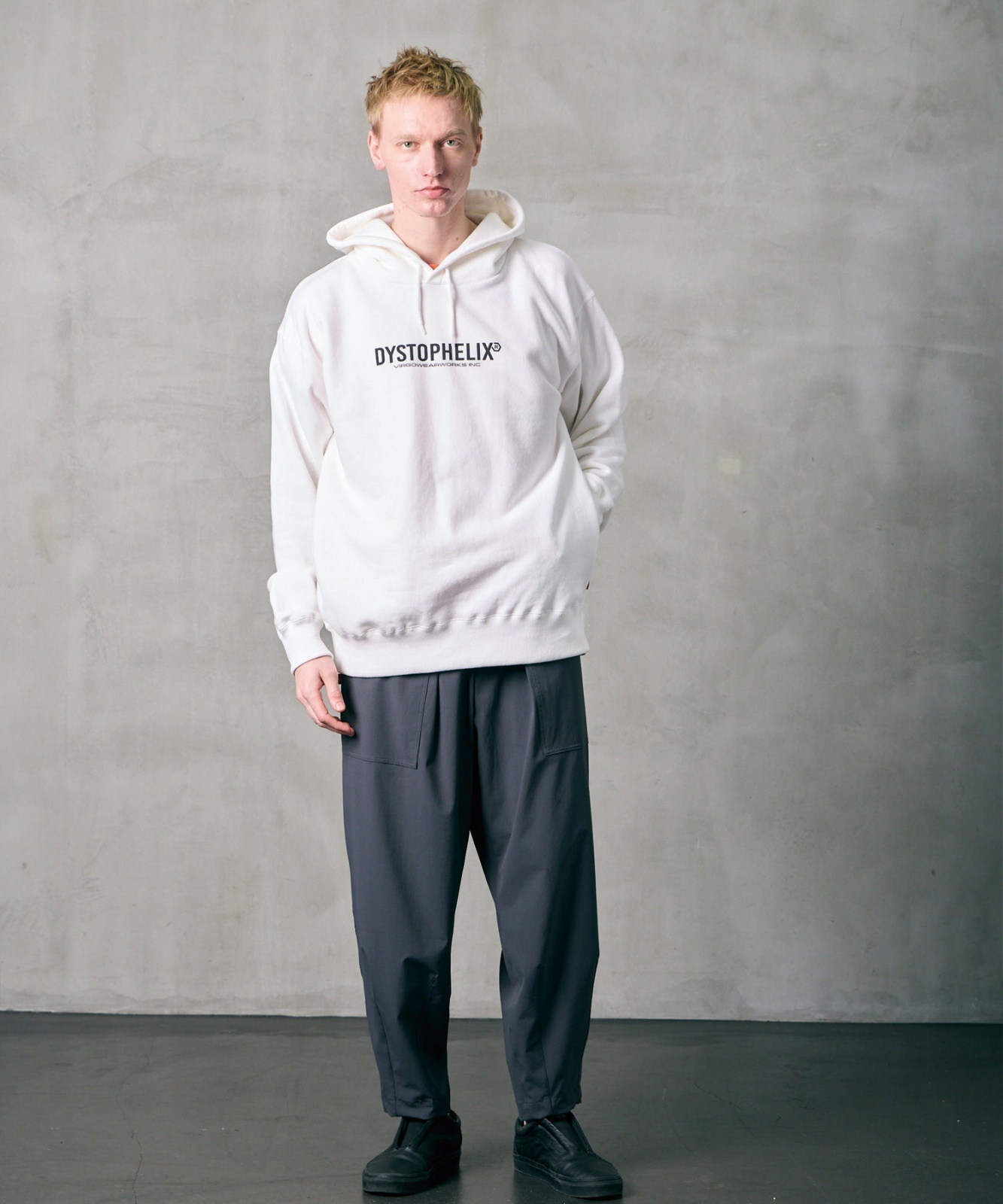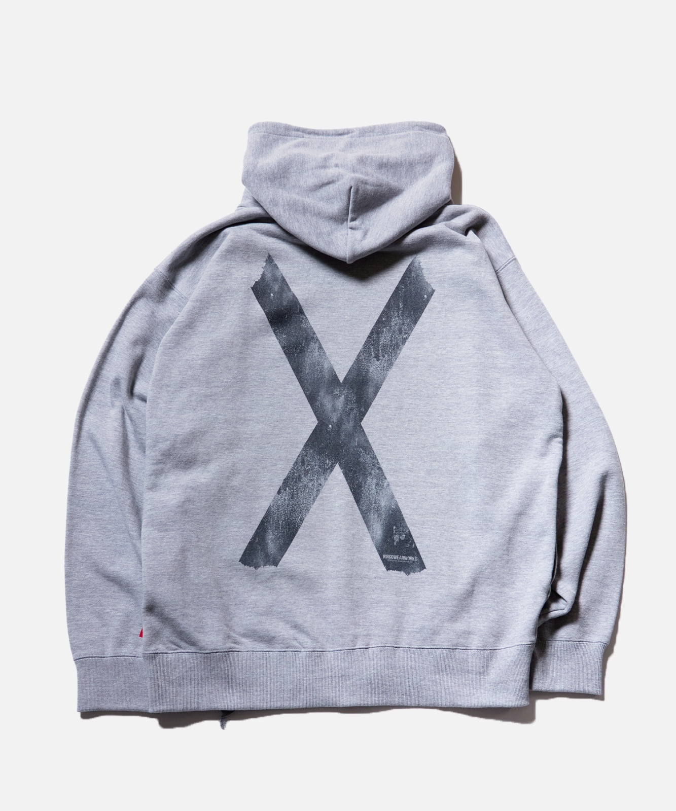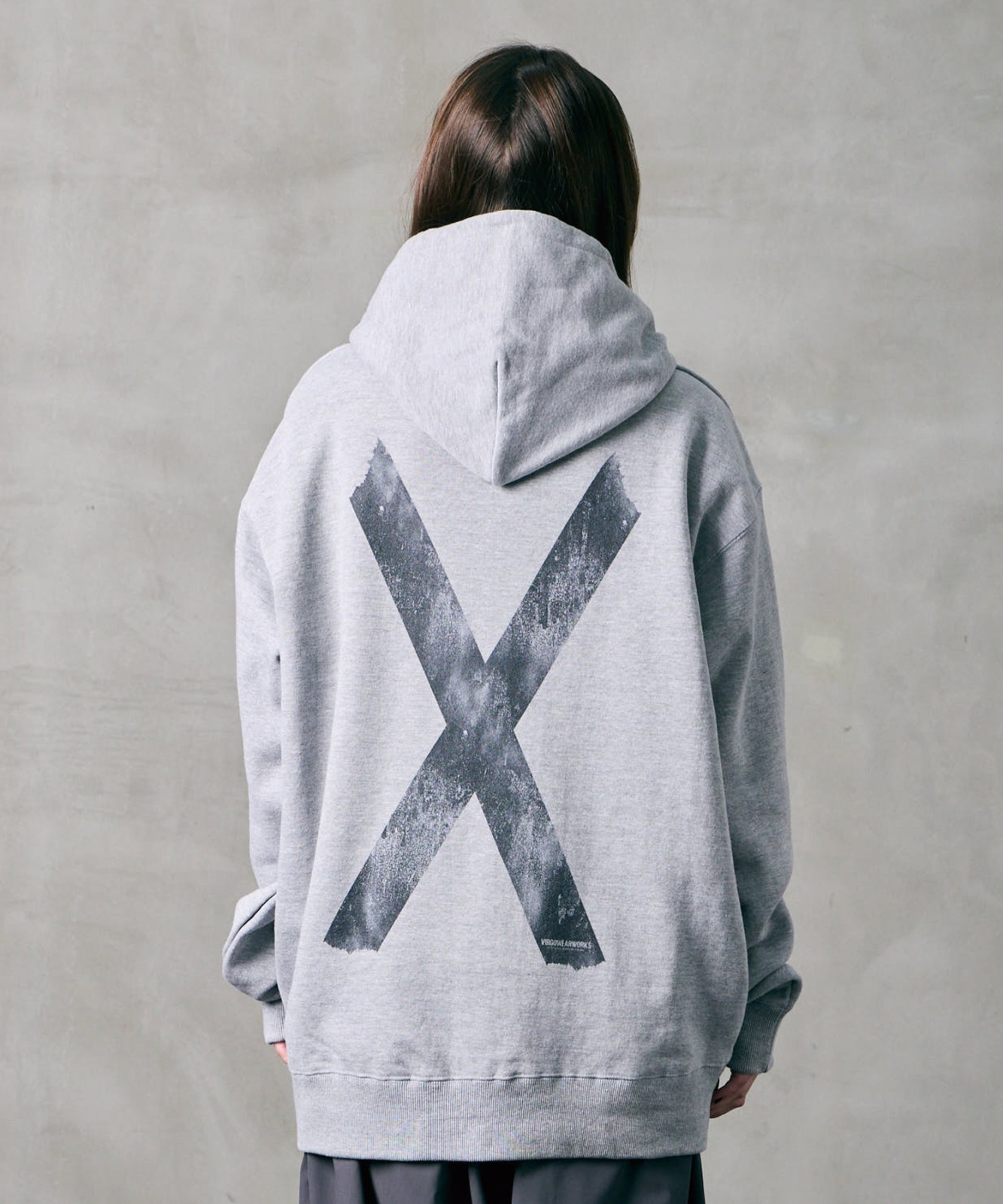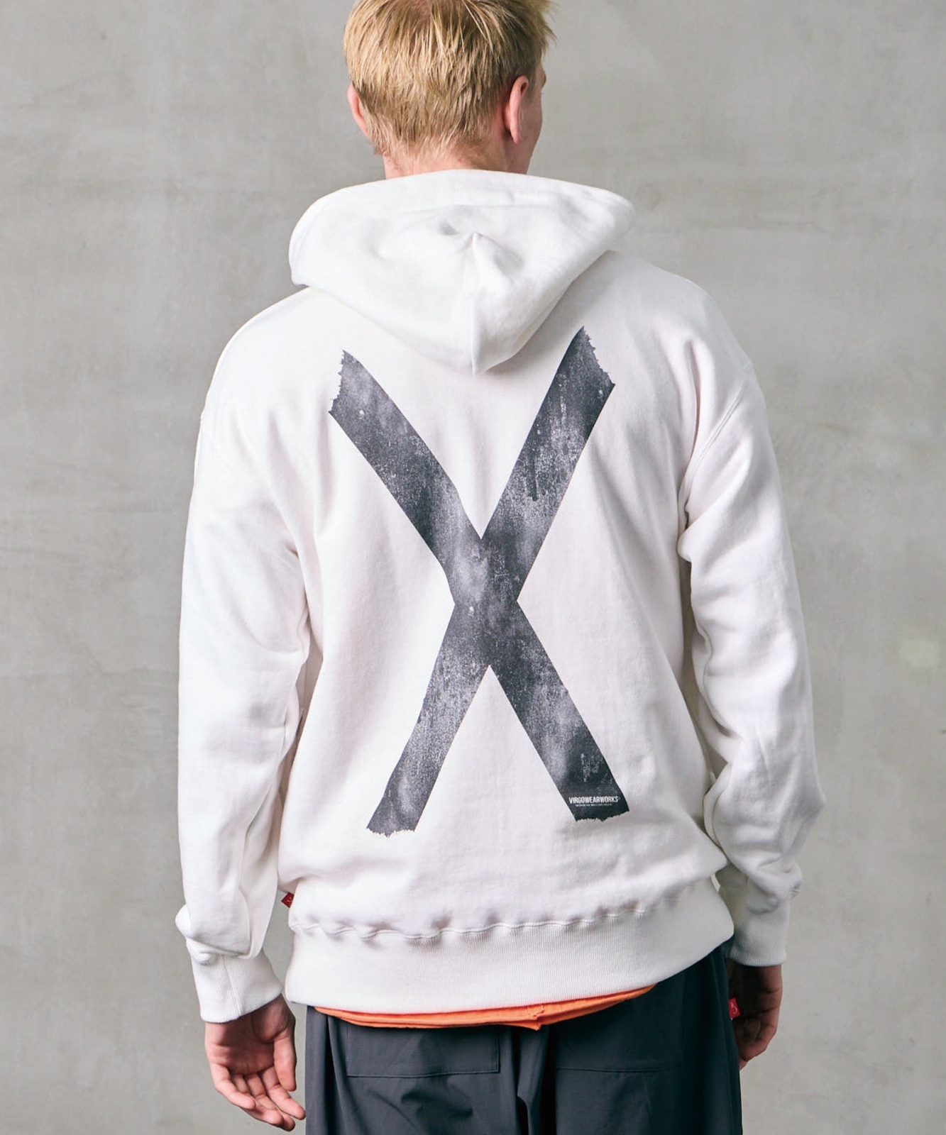 フロント胸にプリントを施し、背中には存在感抜群のクロスデザインを落とし込んだプルオーバーフーディー。