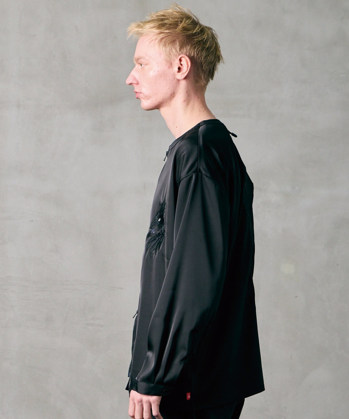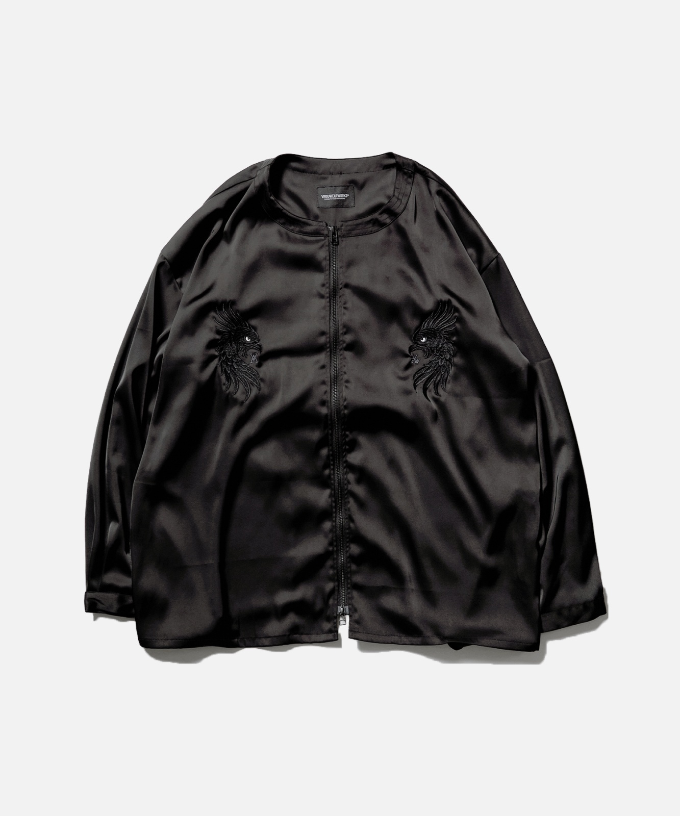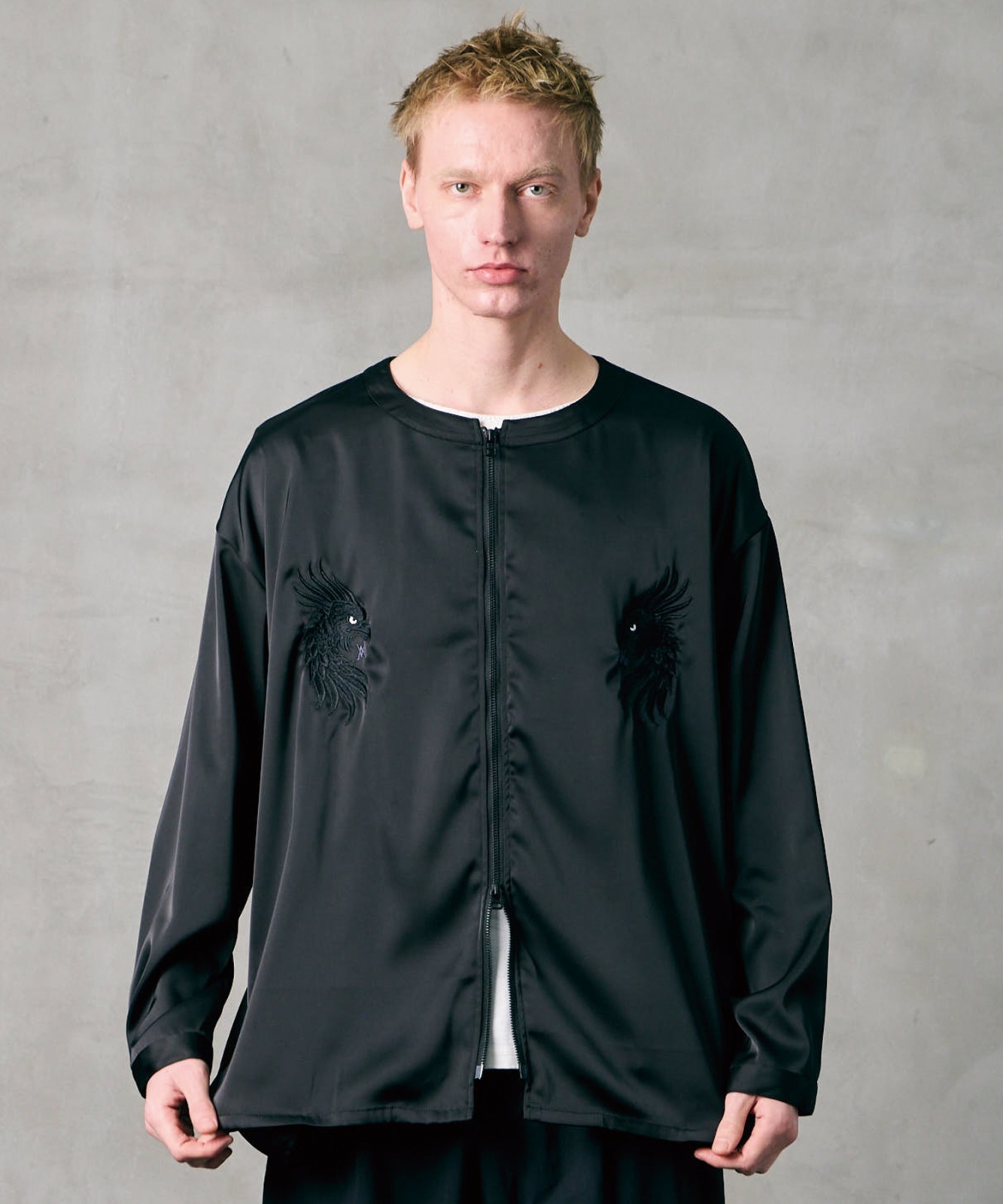 上質なサテン地を使用したミドル丈のノーカラージップシャツジャケット。